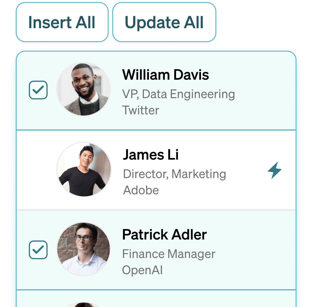 Quickly add new prospects or update existing contacts with the latest information — all in a single click, with unlimited bulk prospecting.